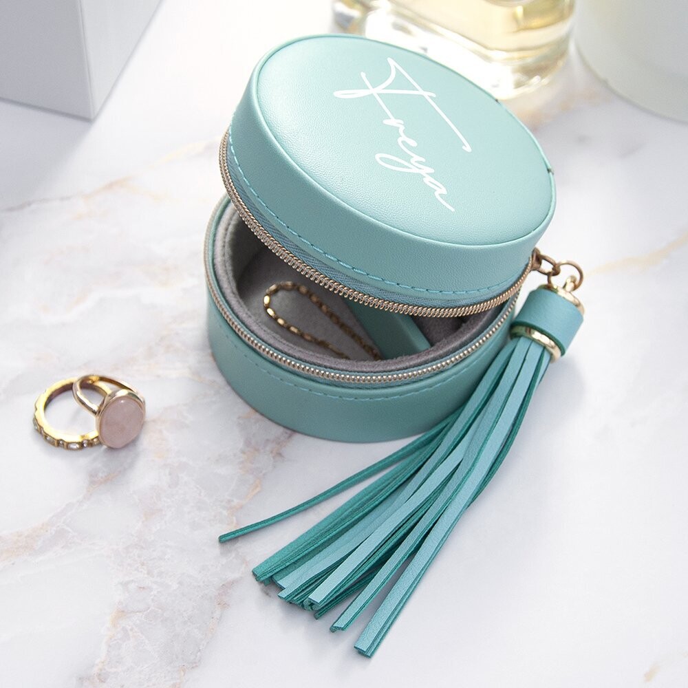 We’ve got the perfect birthday gift for a stylish loved one looking to turn heads on a night out, whilst also keeping their precious jewellery safe when travelling - look no further than our standout personalised Treat Republic turquoise jewellery case with tassel. Your loved one is bound to show off this amazing jewellery case, which is adorned by a beautiful tassel, to all her friends - don’t be surprised if others get their own magnificent jewellery case too as a result! Personalise their gorgeous jewellery case with tassel with their name for a completely unique gift for her. Our fantastic team of artisan creatives will painstakingly print their name in a crisp white script font for a meaningful gift, that special someone in your life is bound to love. Your turquoise round jewellery case comes with a fresh Treat Republic branding and stylish turquoise tassel with gold metal trim as standard. Our standout jewellery cases with tassels also come in a sleek white variety. We also sell beautiful coral, pink and blue jewellery cases without the additional tassel. Name: Up to 12 characters Dimensions: 8cm x 4.7cm